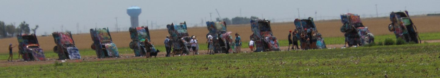 Near Exit 60, you can see to the south an attraction known as Cadillac Ranch. It was created in 1974 by part of the art group from the Ant Farm in San Francisco. Variously referred to as an artwork, a sculpture, or a junkyard. it consists of a row of Cadillacs sitting nose first in a row in the ground. An armada of people have painted the car bodies with graffiti over and over through the years. There were even songs about it by Chris Ledoux and by the Nitty Gritty Dirt Band.